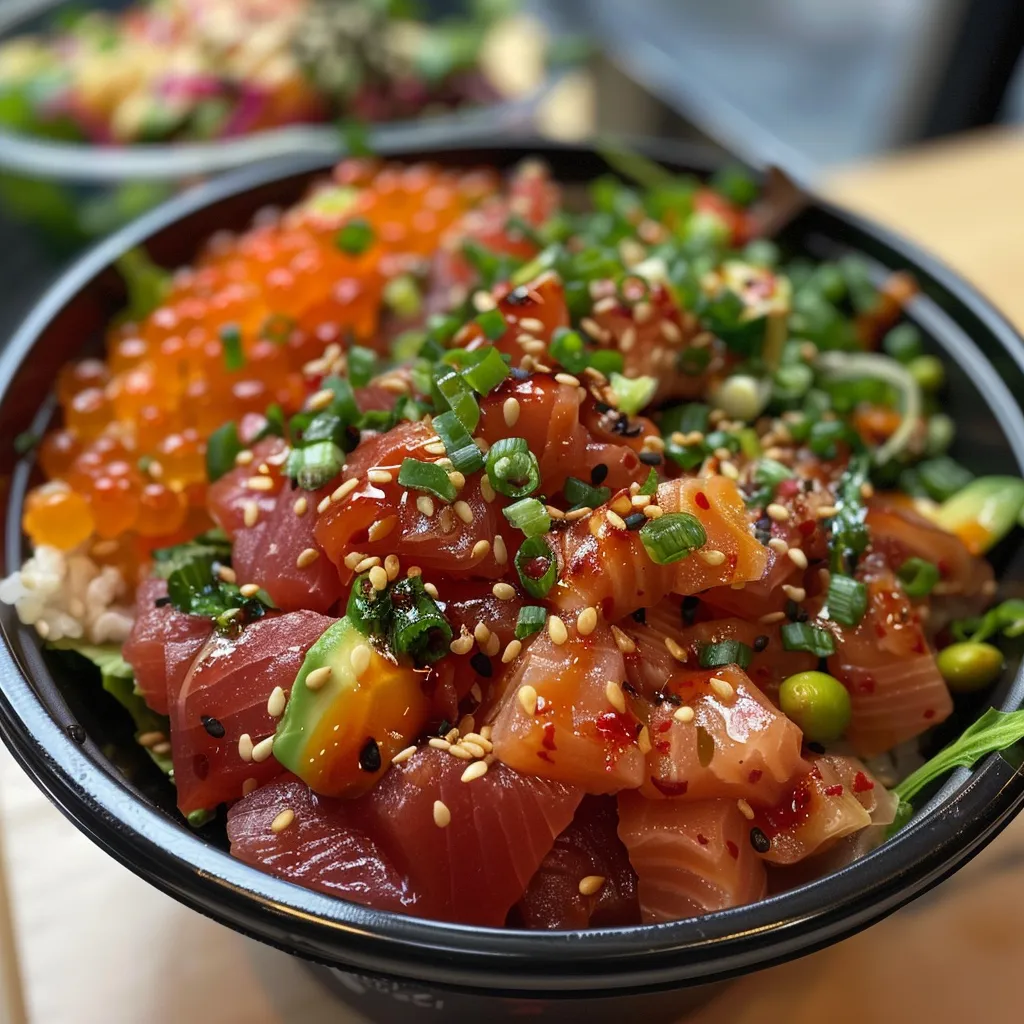 - Step 4: Assemble the Bowl: Divide the prepared sushi rice among serving bowls. Top with the marinated tuna mixture, avocado slices, cucumber, edamame, shredded carrots, and green onions. Finish by sprinkling sesame seeds over the bowl.