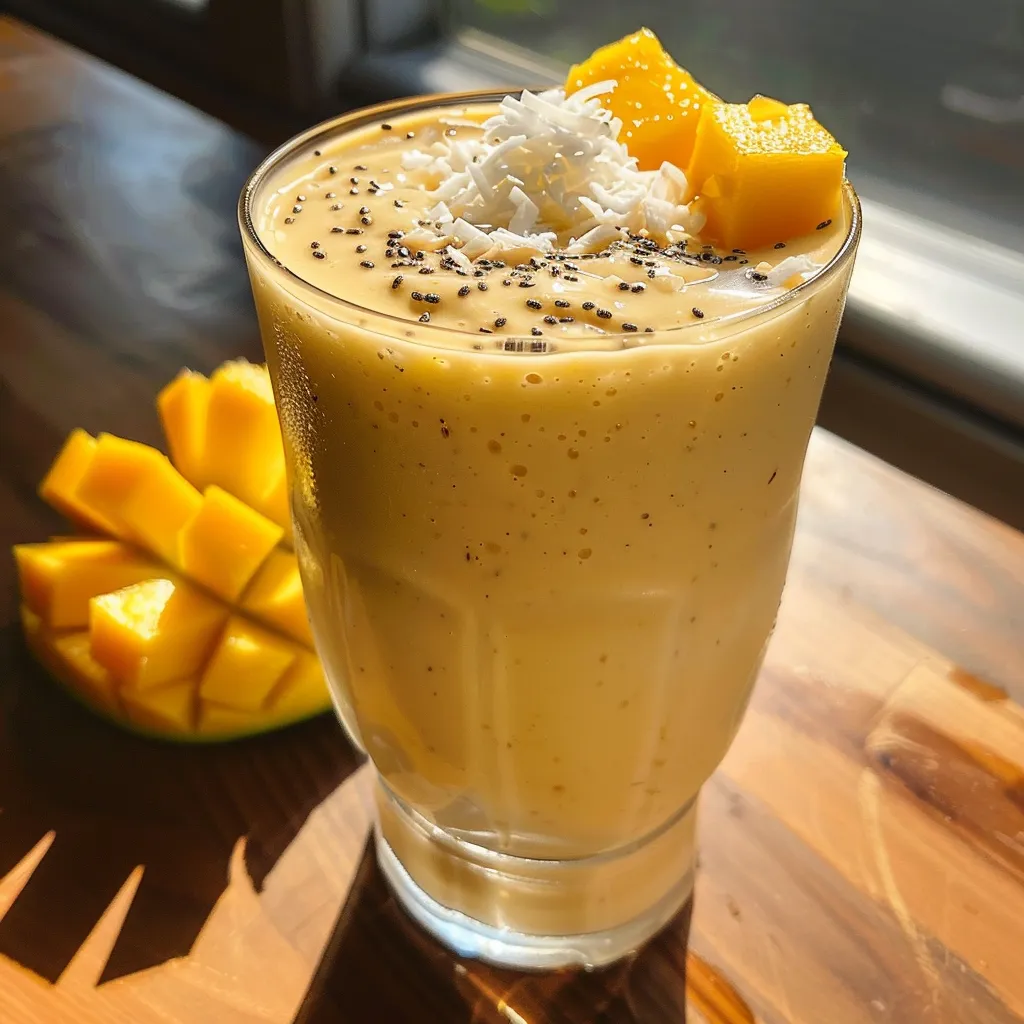 - Taste and adjust sweetness with more honey or syrup if needed. Pour into glasses and garnish with chia seeds, toasted coconut, or mango slices.